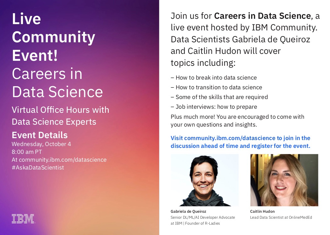 Join us for this exclusive community event on Oct 4, from 11:00 AM to 12:00 PM (ET) where I will have a pleasure to chat with the great Data Scientist Caitlin Hudon live via webcast. We will discuss topics such as breaking into and transitioning to data science, some of the skills required, how to prepare for job interviews, and much more.