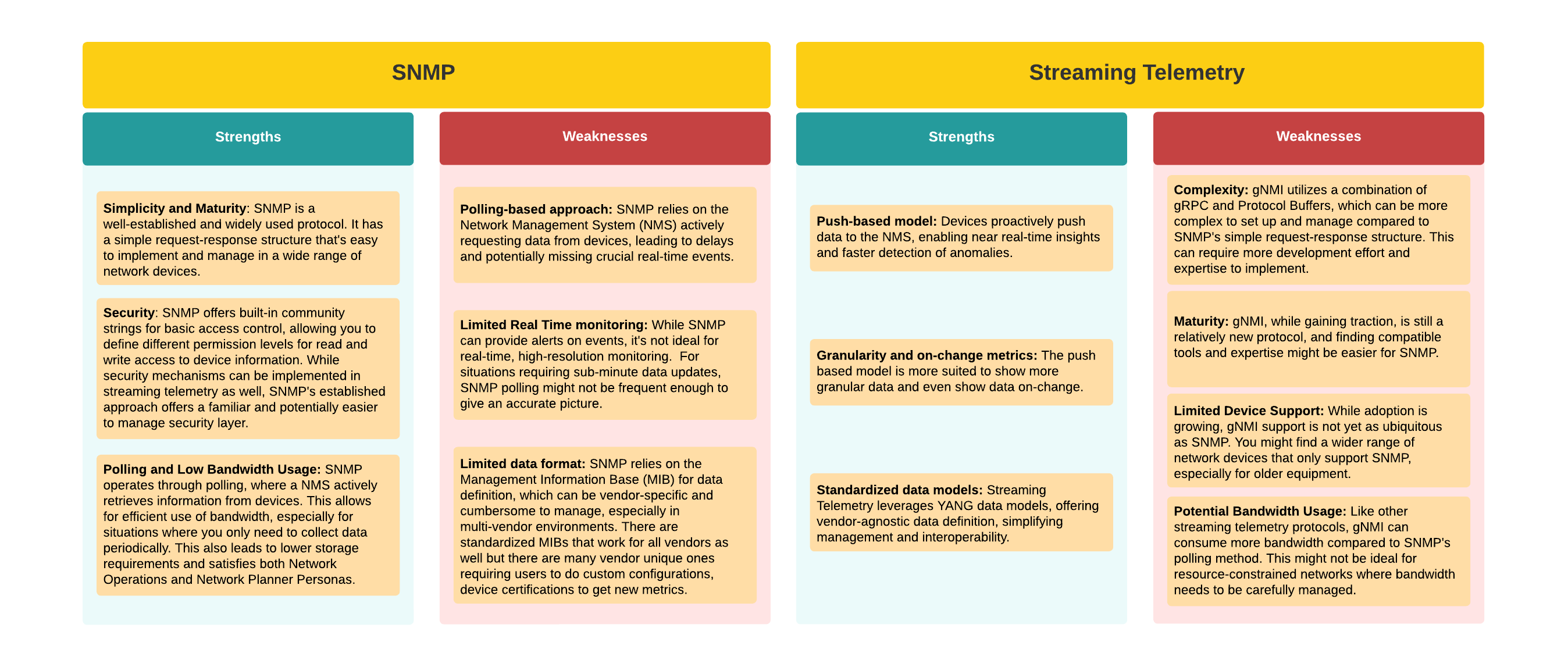 The below matrix talks about some of the strengths and weaknesses of both technologies. For simplicity, we have only referred to one streaming technology, i.e gNMI in our comparisons