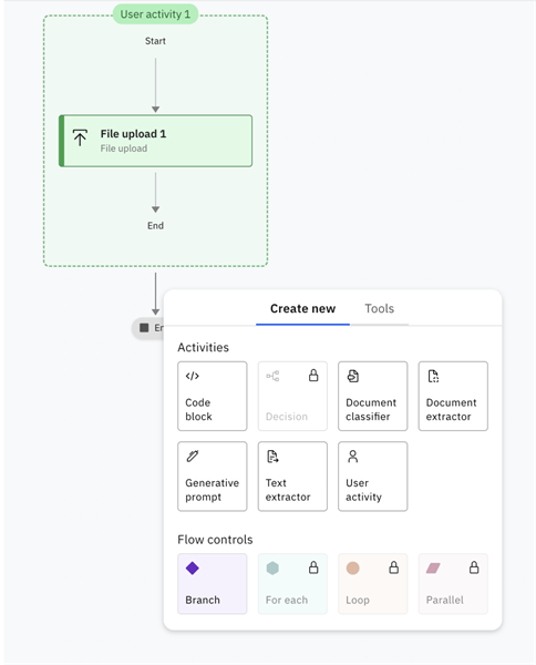 The User Activity is used to collect input from the user. Since this workflow is designed to generate an invoice summary by reading the contents of an uploaded file, Select “File upload” option from Interaction tab