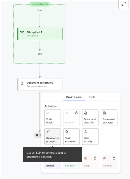 Integrating generative AI capabilities is crucial for producing a meaningful invoice summary. To do this, create a generative AI skill by clicking the “+” button in the flow diagram and selecting “Generative Prompt.”