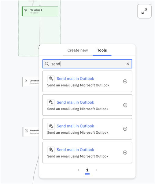 Click on the “+” symbol to add a new component. Navigate to the Tools tab, where you can browse or search for available tools. In the search bar, type “Send Email in Outlook” to quickly locate the tool designed for sending emails via Outlook. Once you find it, select the tool to add it to your workflow.