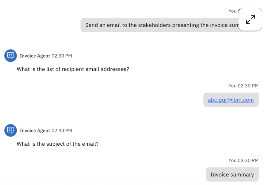 Next, instruct the agent to send the invoice summary to the stakeholders via email. Enter an appropriate message or subject line, then click "Send" to dispatch the email.