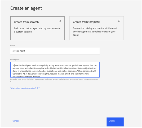 To begin creating a custom solution, the first step is to set up an agent. The user should choose the "Create from Scratch" option, enter a suitable agent name, and provide a brief description outlining the agent's purpose. Once all details are filled in, click the "Create" button to proceed.