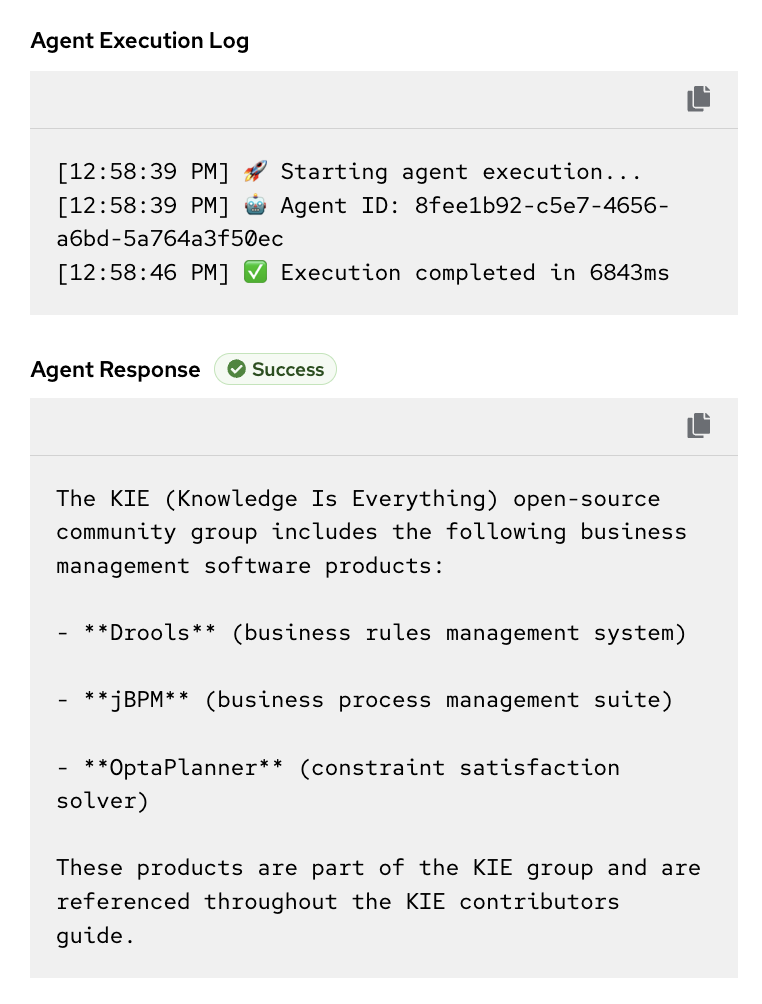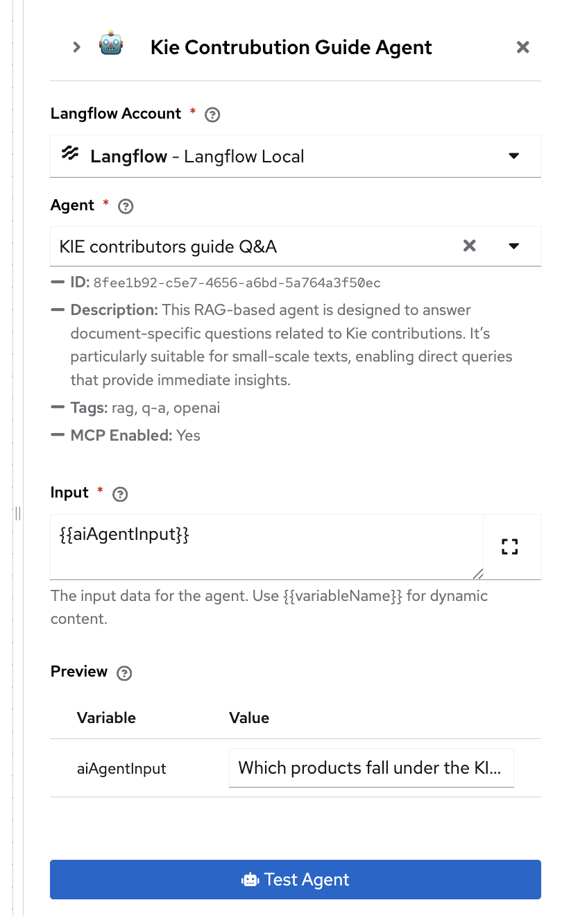 To use the AI Agent Task in production, add the appropriate work item handler dependency (for Quarkus or Spring Boot) to your project and configure your Langflow credentials in `application.properties`. At runtime, the handler will execute the selected Langflow flow, passing in your mapped variables and returning results to your process variable.