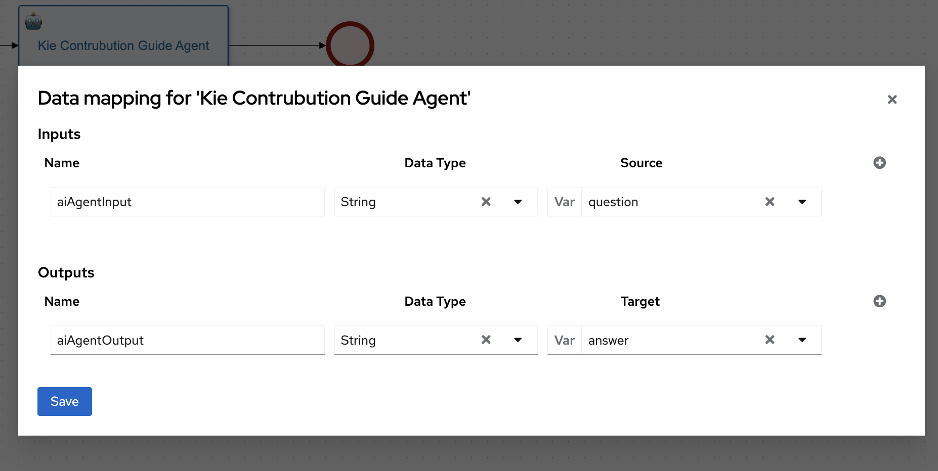 3. Deploy your business service as usual. When the workflow reaches the AI Agent Task node, the handler will connect to Langflow, send the input, and return the output to your process variables automatically.