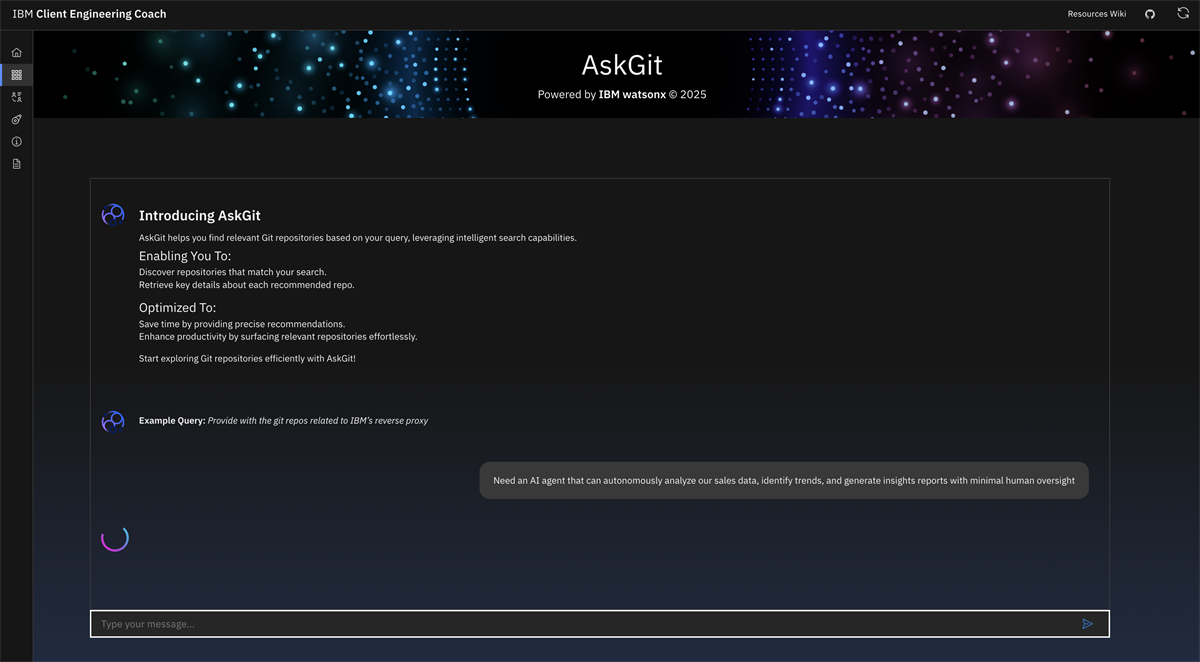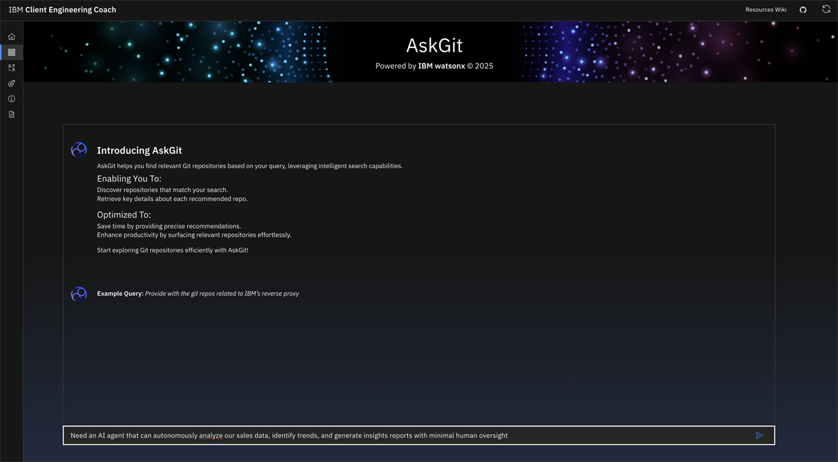 AskGit solves this problem. It’s an AI-powered internal tool that helps IBMers discover the most relevant Git repositories simply by describing their project or use case in natural language.