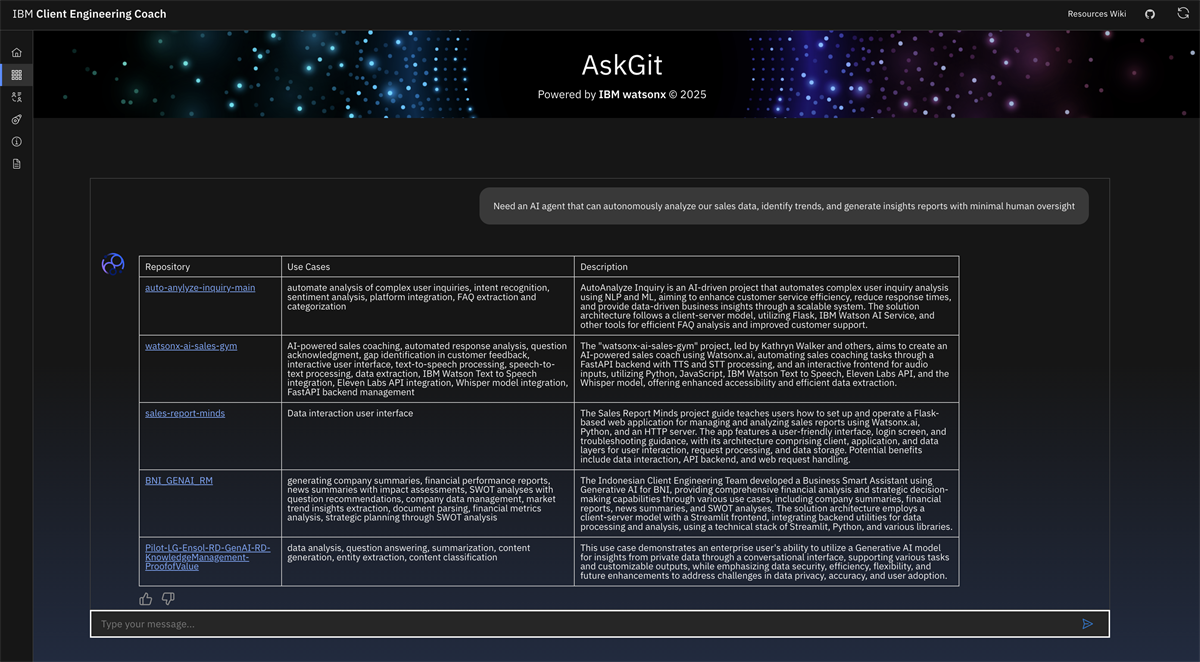 AskGit’s vector store currently covers 1,483 repositories across IBM’s major GitHub organizations: representing a comprehensive, global snapshot of Client Engineering and Tech Garage projects.