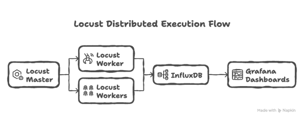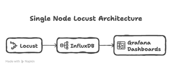 Locust generates load, InfluxDB stores time-series performance data, and Grafana provides real-time visualization using pre-configured dashboards. All components run through Docker Compose to provide a consistent, reproducible environment suitable for developer machines.