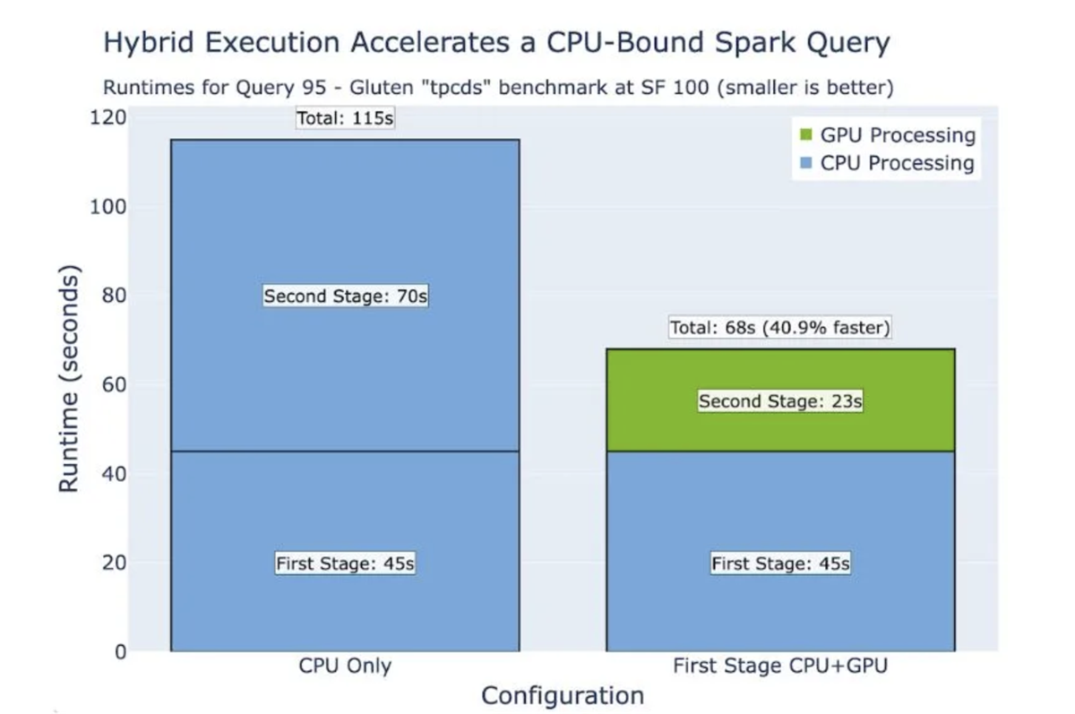 For example, the second stage of TPC-DS Query 95 SF100 is compute intensive and can slow down CPU-only clusters. Offloading this stage to GPU achieves significant performance gains. CPU capacity remains on the cluster, available for other queries or workloads.