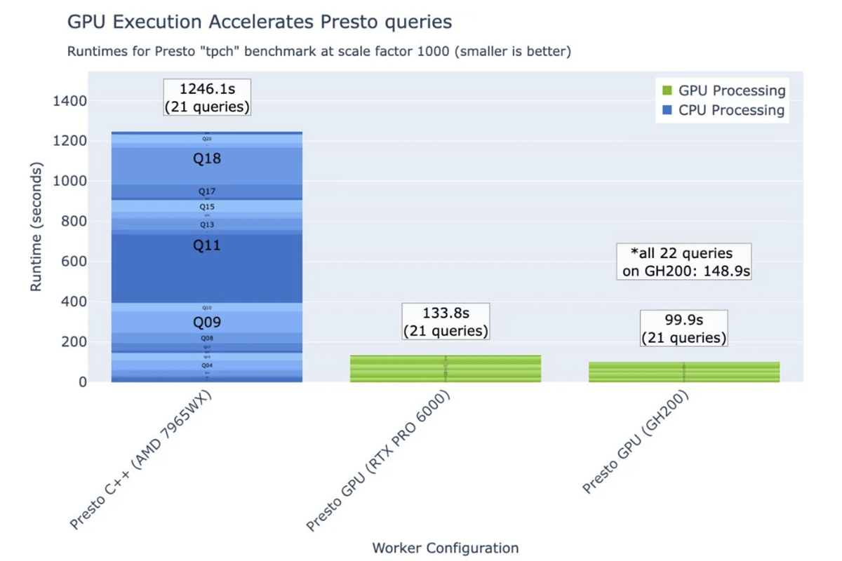 As shown in Figure 2, at scale factor 1,000, we observed 1,246 seconds runtime for Presto C++ on AMD 7965WX, 133.8 seconds runtime for Presto on NVIDIA RTX PRO 6000 Blackwell Workstation, and 99.9 seconds runtime for Presto on NVIDIA GH200 Grace Hopper Superchip. We also used CUDA managed memory to complete Q21 on GH200 (see Figure 2 asterisk), yielding 148.9 seconds runtime for Presto GPU on the full query set.