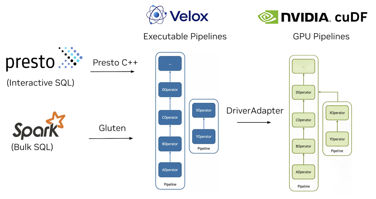 Driving GPU acceleration in the shared execution engine Velox unlocks performance gains for a wide array of downstream systems across the data processing ecosystem. The team is working with contributors across many companies to implement reusable GPU operators in Velox, and in turn accelerate Presto, Spark (through Gluten), and other systems. This approach reduces duplication, simplifies maintenance, and introduces new innovations across the open data stack.