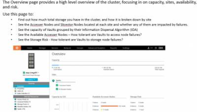 - Configuration of IBM Cloud Object Storage. For example, Storage Pools, Access Pools, Slicestor nodes, Accesser Nodes, and Vaults.