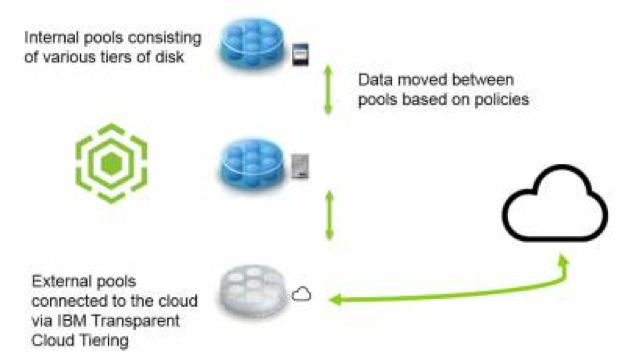 The following diagram shows an IBM Spectrum Scale cluster, which is made up of pools of storage. You can set up policies to move files between pools of different storage technologies based on how frequently the data is accessed. For example, you move files that haven't been touched in 30 days or so from a SSD pool to a pool backed by nearline disk. Using IBM Transparent Cloud Tiering, you can set up an external pool that is connected to a cloud service, such as Amazon Simple Storage Service (S3). You can designate, that if a file hasn't been touched in 60 days, it should be moved to the cloud; this effectively makes the cloud a less expensive tier of storage.