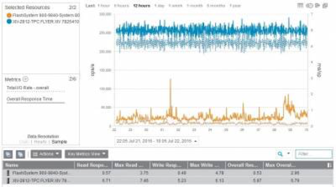 The following figure shows the performance of two storage systems on a chart and in a table. By default, the performance view shows the Total I/O Rate - overall and Overall Response Time metrics. The time-period for the information is the last 12 hours.