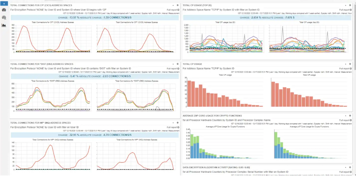 The dashboard shown in Figure 4 was seamlessly customized by combining reporting from Address Space (SMF type 30), Encryption activity (119.12), TCP/IP (119) activity across MQ, DB2, and CICS subsystems with Crypto activity (113).