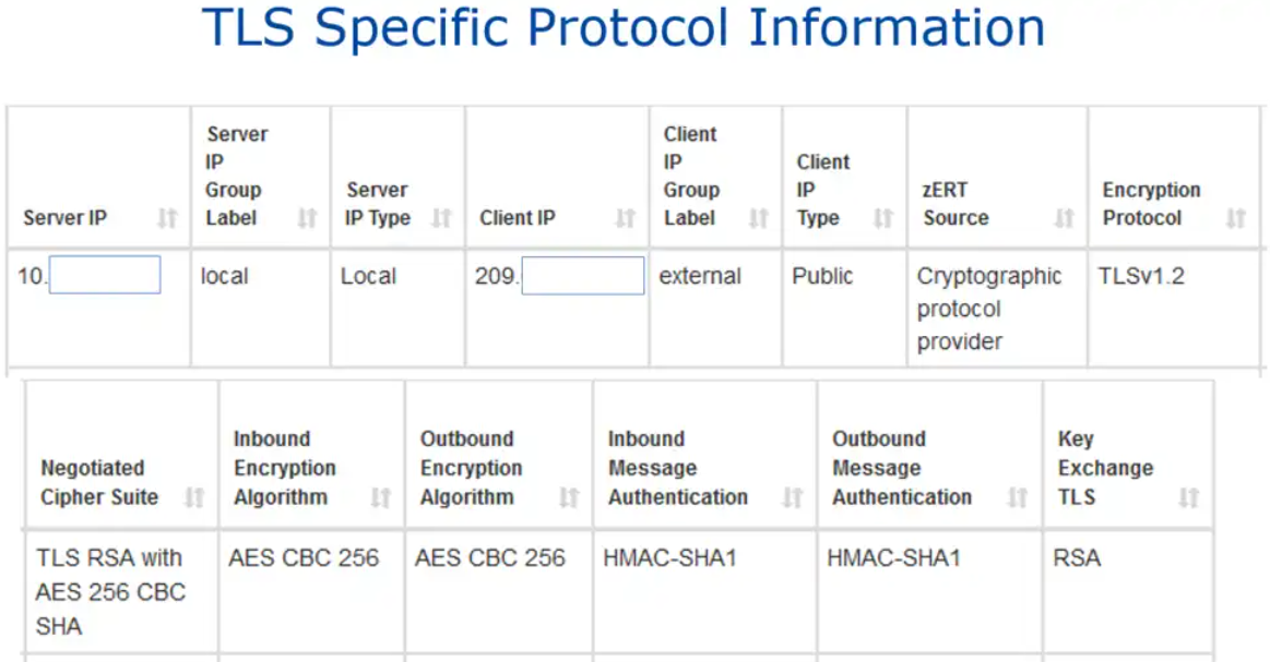 Here is an example of the data provided from a zERT Summary record for data encrypted with the TLS protocol (with data from a single record broken into 2 lines for readability).
