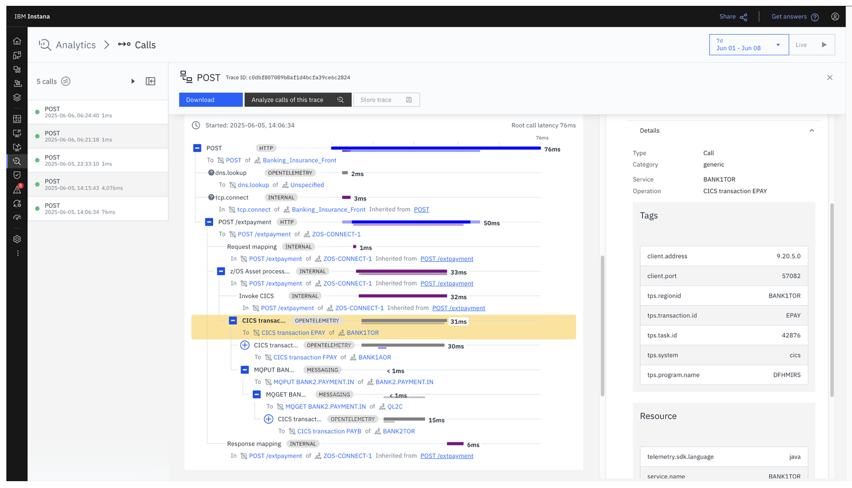 Access to the data is important, and Z Observability Connect delivers this in a simple to manage approach. How you leverage and exploit this is also very important. There are many solutions available today that can consume OpenTelemetry span data however, the capabilities provided by these solutions can vary considerably. One possible observability backend for these trace space is IBM Instana Observability. With Instana, integration of the trace spans from z/OS together with metrics and logs can eliminate potential blind spots in critical business applications and enable Site Reliability Engineers (SREs) and other operations teams detect, isolate and resolve incidents faster.