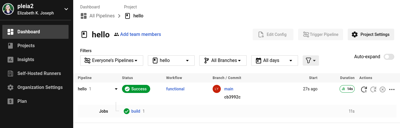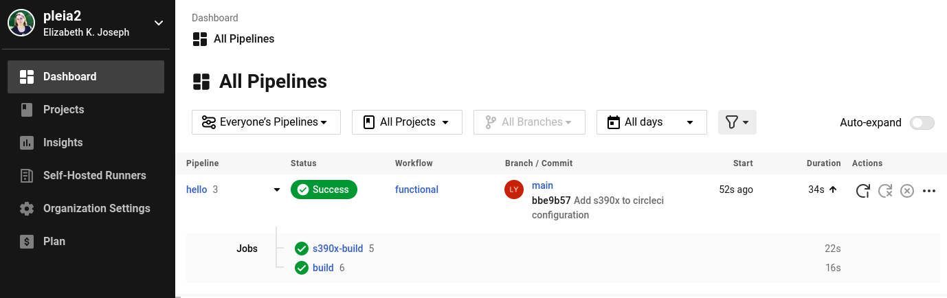 Congratulations! You’ve now tested code with CircleCI. This initial example uses a hosted, containerized x86 environment provided by CircleCI. We now want to move forward with setting up testing for s390x.