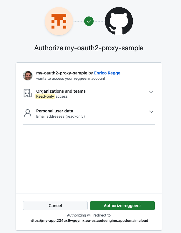 You’ll be redirected to GitHub.com, once you’ve passed the authentication you’ll be asked you to authorize the OAuth app "my-oauth2-proxy-sample".