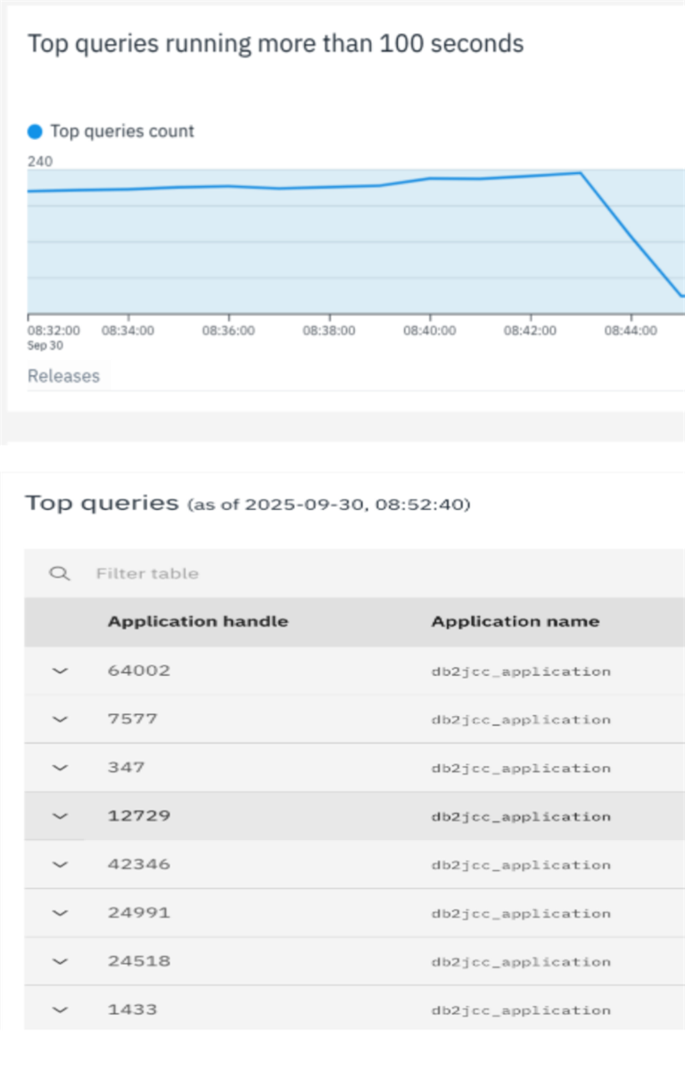 Isolate Top Offenders: Zoom in on the time range of the spike within the "Queries in lock-wait" graph. This action populates a detailed table of top queries involved. This table includes the Application handle, Session authorization ID, and the total Elapsed time the query has been running.