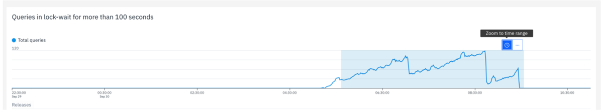 Validate Lock Impact: On the details page, review graphs that plot the count of "Top queries running more than 100 seconds" and "Queries in lock-wait for more than 100 seconds."