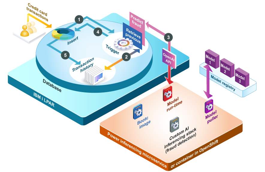 The IBM i LPAR contains a database of credit card transactions. The schema contains the following database elements: