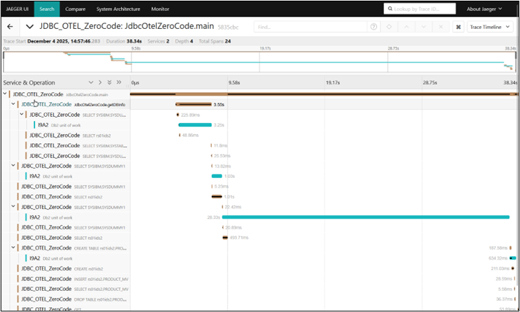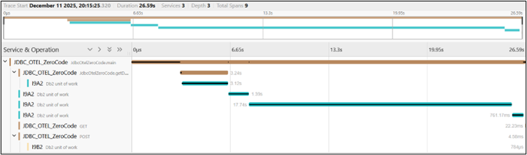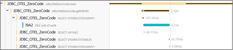 Zero-code instrumentation injects your Java code at certain places. For example, when your Java code executes a JDBC call it creates a new span for every single JDBC execute call of your Java application. However, the Db2 span is created as child span for the first JDBC call in the Db2 unit of work.