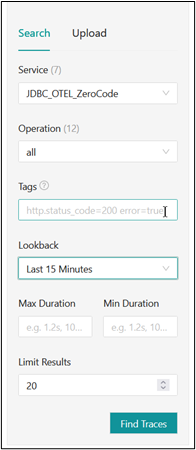 In the Jaeger search window, you should see the service name which you provided in the OTEL_SERVICE_NAME  environment variable under the “Service” drop down.
