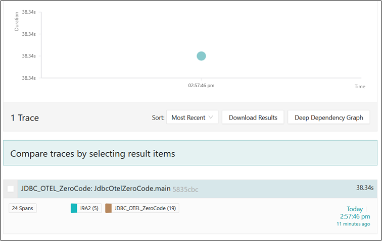 Every bar in this graph represents one span for which OTEL has captured execution times and other metrics. Most of the spans are generated in your JDBC application (by the Java agent), the rest of the spans (in blue color in this example) by Db2.