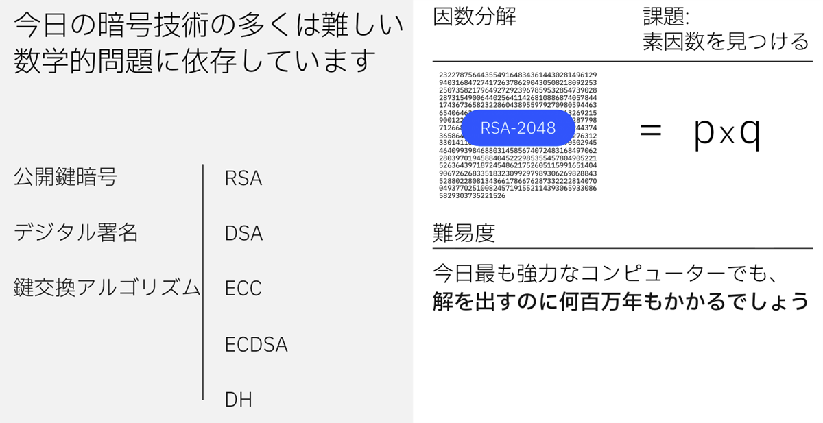 量子コンピューターにより現在の暗号化が危殆化してしまうという問題があります。まだまだ現実感のない話に聞こえますが、海外各国では対策の話が始まっていたりなど、日本においても注視すべき問題です。