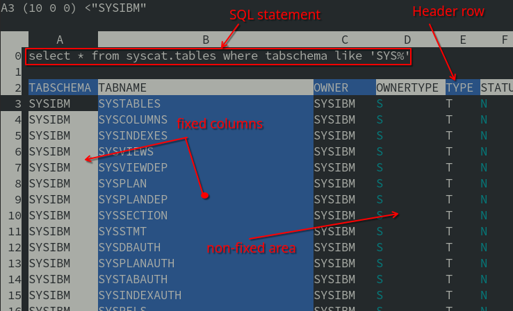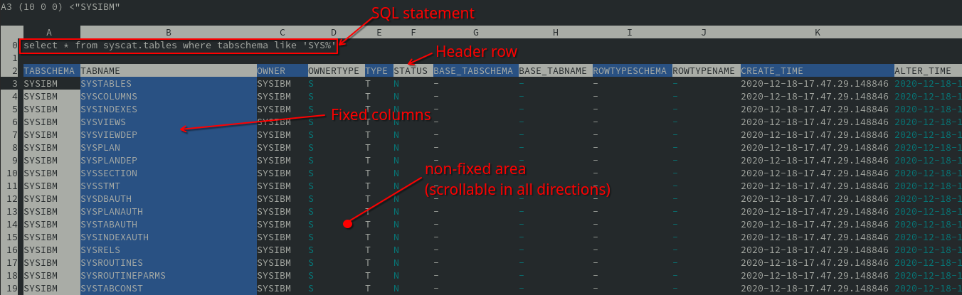 In the end, all these methods are cumbersome, since you need to know the column names and must arduously tailor SQL statements to display result sets in a somewhat readable way. Instead, imagine now we can reap the benefit from fixed header rows and columns and from scrollable fields, as in the example below: