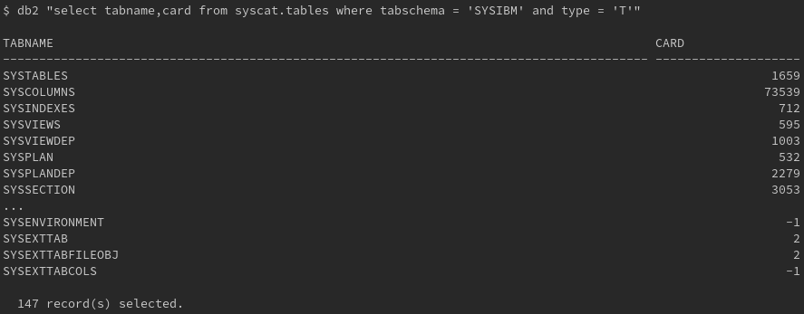 $ clpsc.ksh "select * from syscat.tables where tabschema like 'SYS%'"