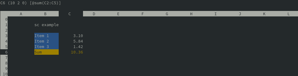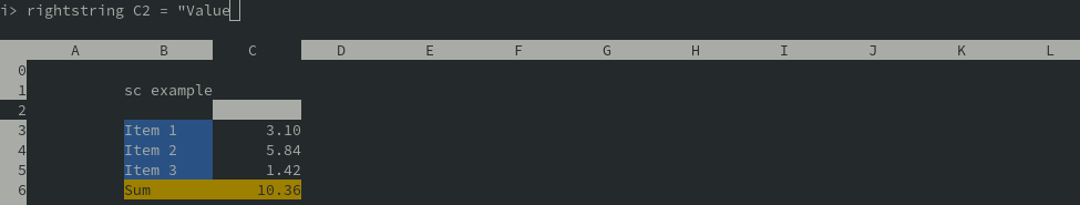 The features of sc include the availability of functions and the use of colours. In the current cell, you can enter a number (using command “=”), a string (left justified using “<”, right justified using “>” or centred using “\”). Use “x” to delete the content of the current cell.