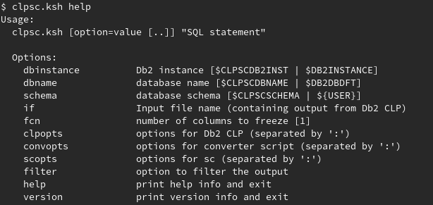 Note that clpsc.ksh can display Db2 CLP output in any environment (i.e. without any Db2 software installed). See option if described later on in this section.