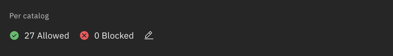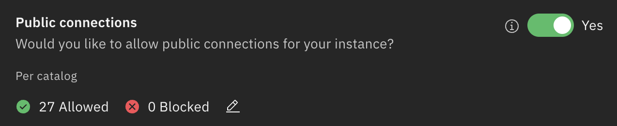 If you would like to configure public connections for a subset of your catalogs, leave the “Public connections” toggle set to Yes. To configure public connections for your catalogs, click the edit icon next to the catalog status.