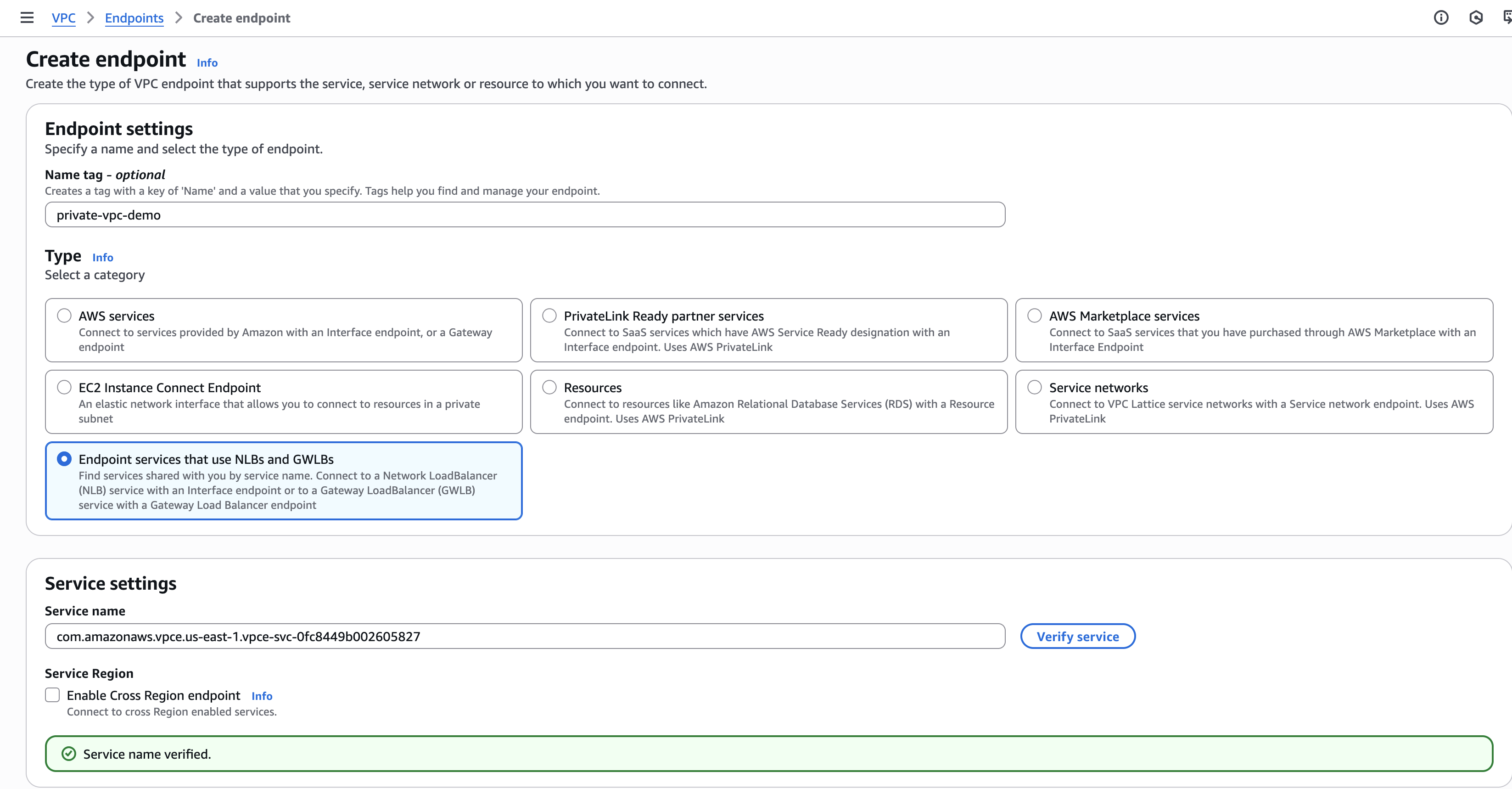 The service name of the VPC endpoint service and the private DNS name for the API gateway can now be used to complete the private connection.