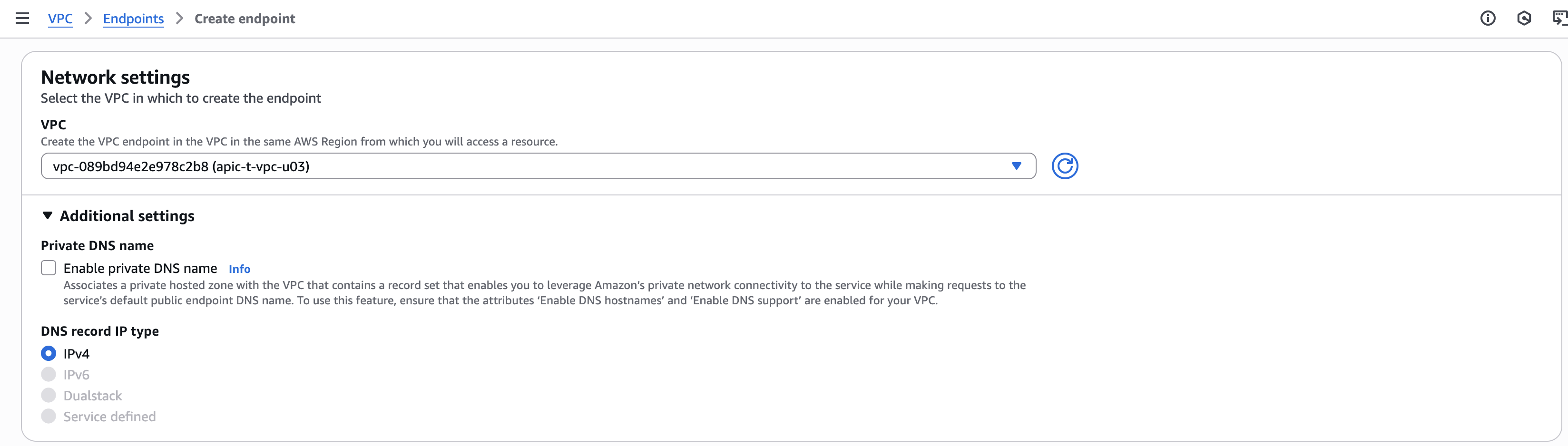 Under "Network Settings", choose VPC (ensure your VPC endpoint is created in the same AWS Region as your VPC and the resource you intend to access).