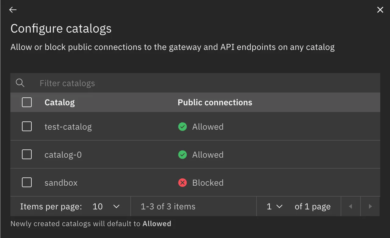 This will load a new panel allowing you to batch block/enable public connections for your catalogs. This is a great addition for users who only want a subset of their catalogs to allow or block public connections. Note that newly created catalogs will default to Allowed. If you are using this page to batch edit all catalogs, you may want to stick with the instance-wide toggle on the previous page.