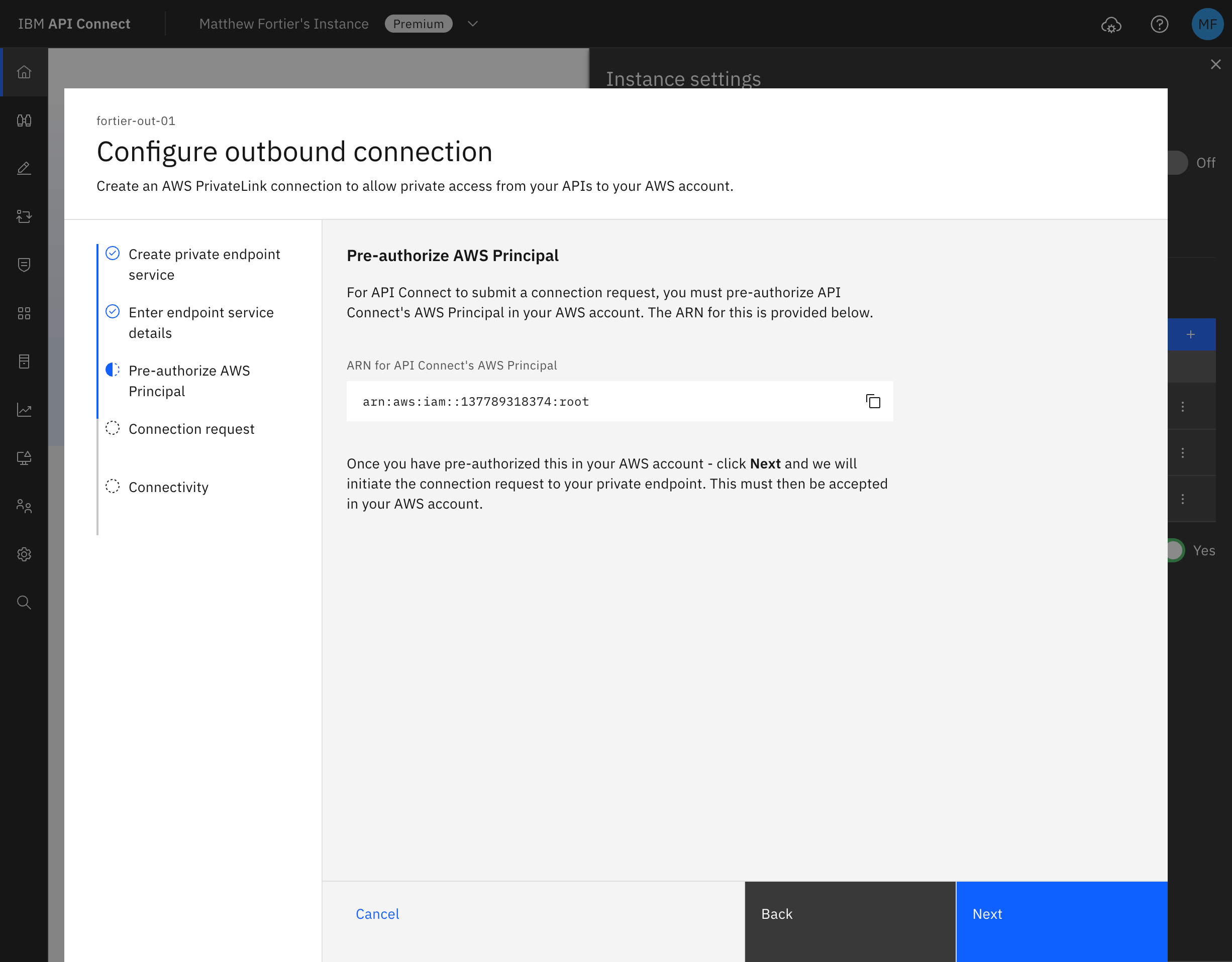 Now we’ll authorize the API Connect account to access your VPC endpoint service. Copy the AWS principal ARN from the Pre-authorize AWS Principal page in the wizard.