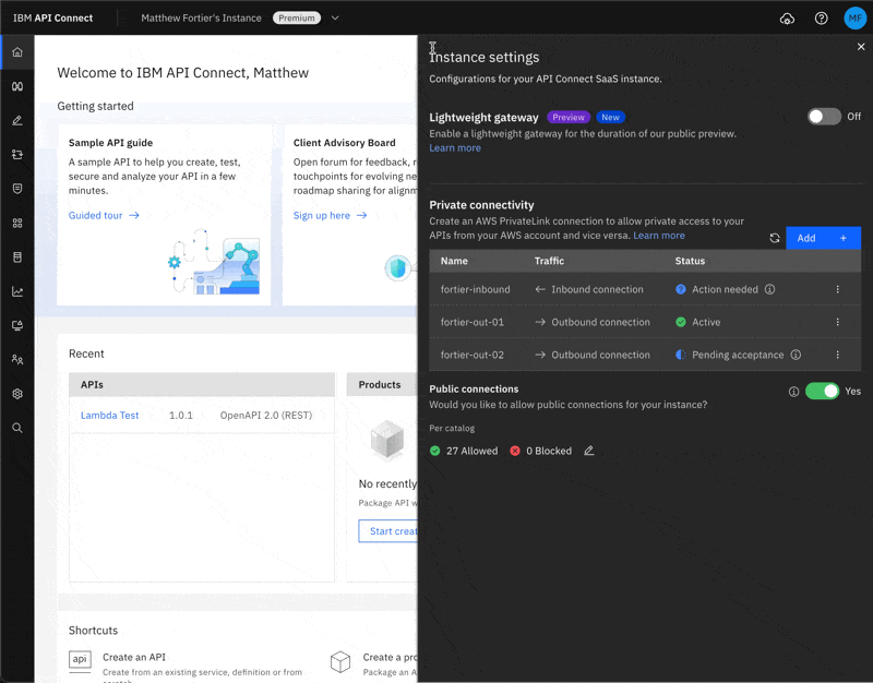 A significant enhancement in Private Connectivity v2 is its move from catalog settings to the API Connect on AWS Instance Settings panel. This panel makes it easier to highlight exclusive API Connect on AWS features like Private Connectivity and provides both a fresh design and convenient access throughout the product. Watch this panel for future exciting features.