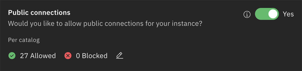 Once you have configured at least one inbound or outbound connection, you’ll be able to configure public connections for your instance and/or your catalogs. You’ll find that public connections are enabled by default, represented by the toggle switch being set to Yes.