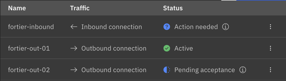 You will now find that a connection has been created but is not configured. The user is now able to close this wizard if need be, and can return to it by navigating to the “Private connectivity” section once again, locating the connection row in the table, opening the overflow menu, and clicking Continue.