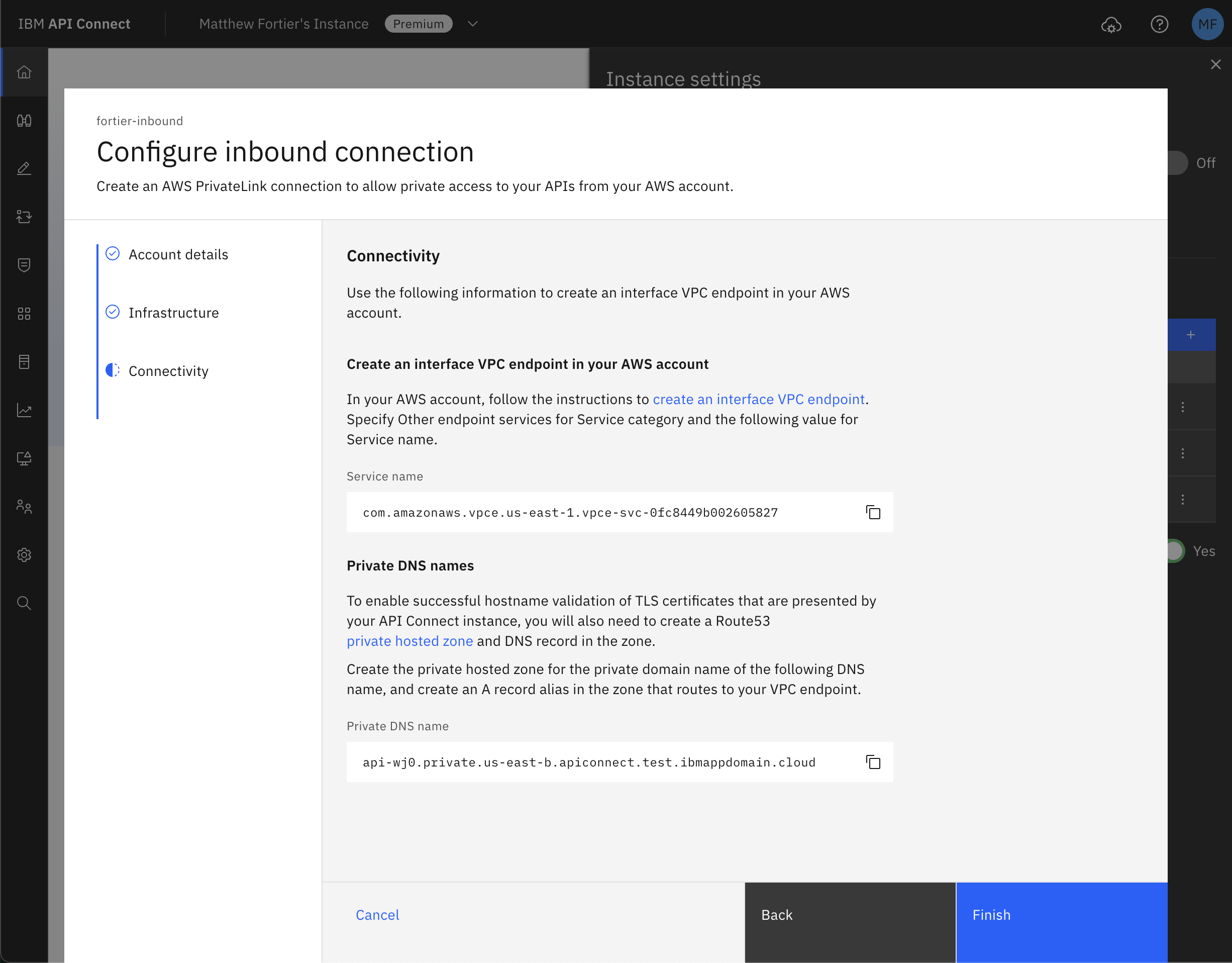 With these steps completed, the Private DNS name shown in the Connectivity page in the wizard can be used in place of the public DNS name for the API gateway to access an API Connect API privately.