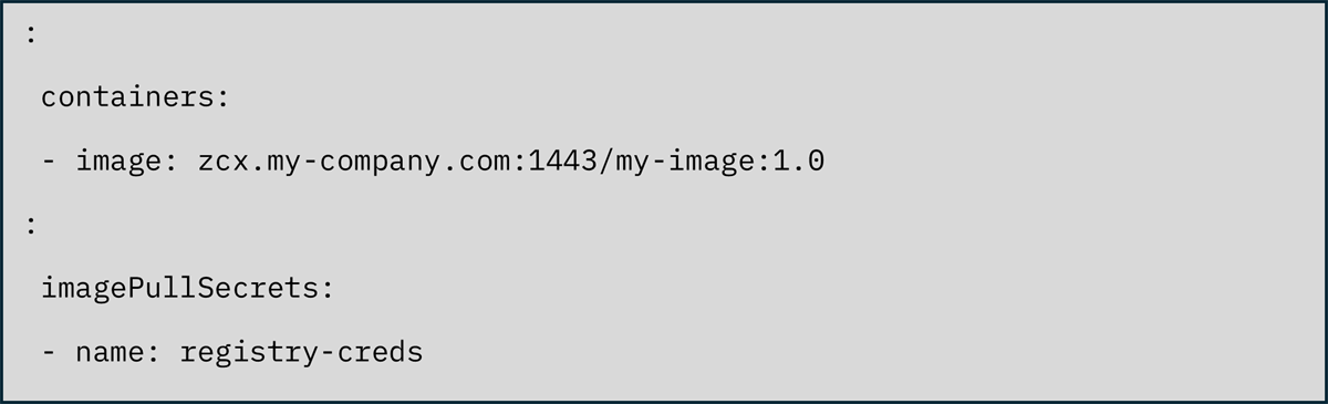 Once the Kubernetes secret is generated, add the imagePullSecrets label, pointing to the secret we created, to your deployment yamls that are pulling images from your private container registry.