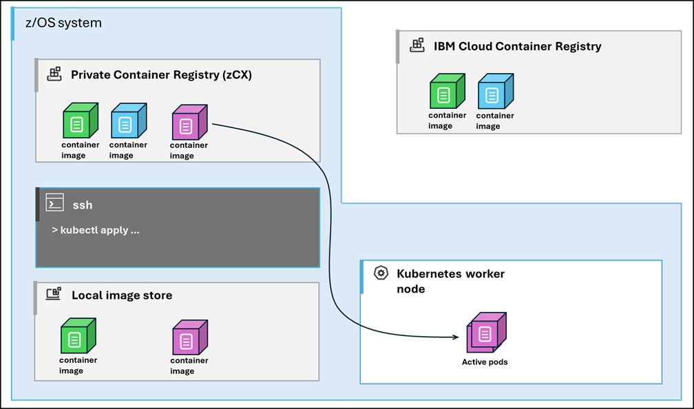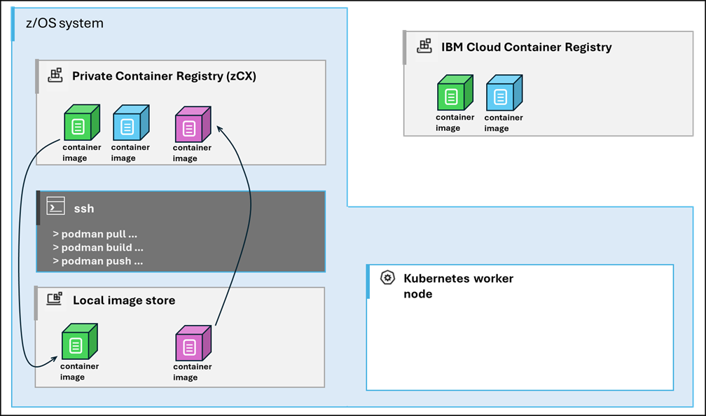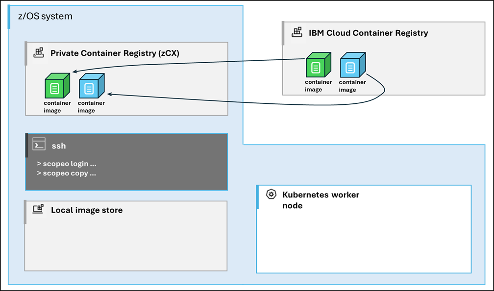 In this article, you will learn how the private container registry can now be used for pulling and pushing container images for IBM® z/OS® Container Platform (zOSCP). You start by copying zOSCP container images to your private registry and making them available to your users building their own container images and eventually for your Kubernetes deployments.