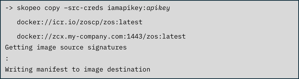zOSCP provides IBM z/OS for Skopeo (Skopeo) to copy container images from IBM Cloud Container Registry to your private container registry. Use an SSH client to access the z/OS UNIX environment where Skopeo is installed. The zOSCP container images on ICR are accessed by using an API key. The instructions for obtaining the API key are included in an entitlement memo when the z/OS Container Platform product is ordered.