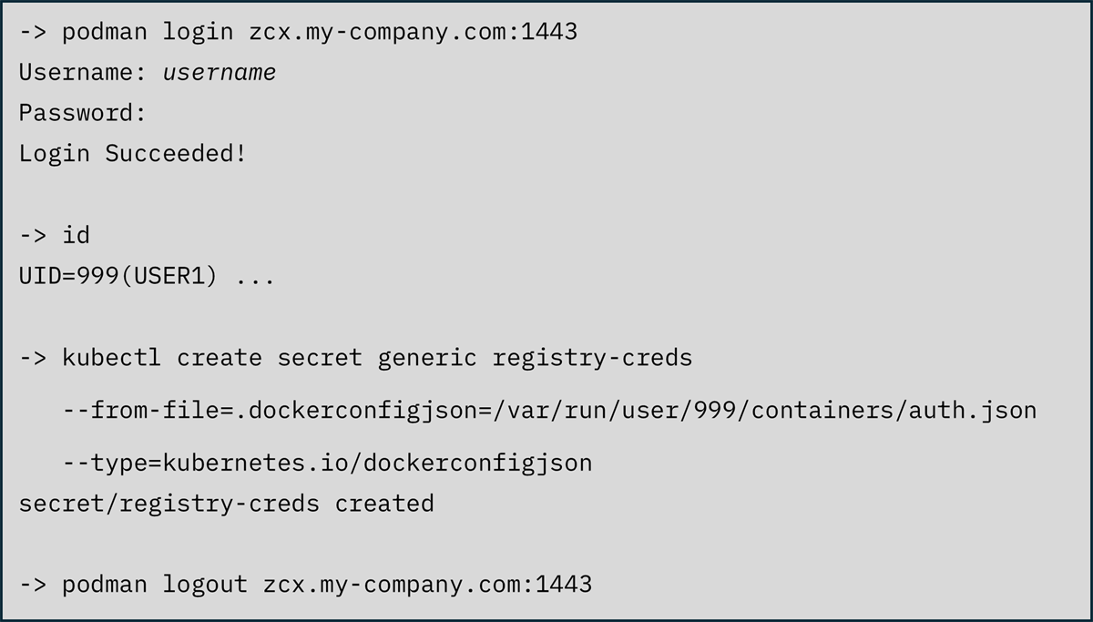Unlike with Skopeo and Podman where you can log into your private container registry to authenticate, Kubernetes does not provide this type of authentication. Instead, a Kubernetes secret needs to be configured and referenced in any deployment yaml pulling images from the private registry.