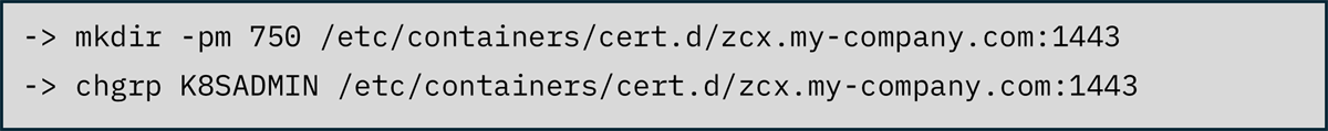 Certificates for container registries are stored in /etc/containers/cert.d. Referring to the previous article, you created a private container registry within a zCX instance called my-zcx.my-company.com that was listening on port 1443. Issue the following commands to create the subdirectory to store the private registry certificate and provide permission to your users to access it.
