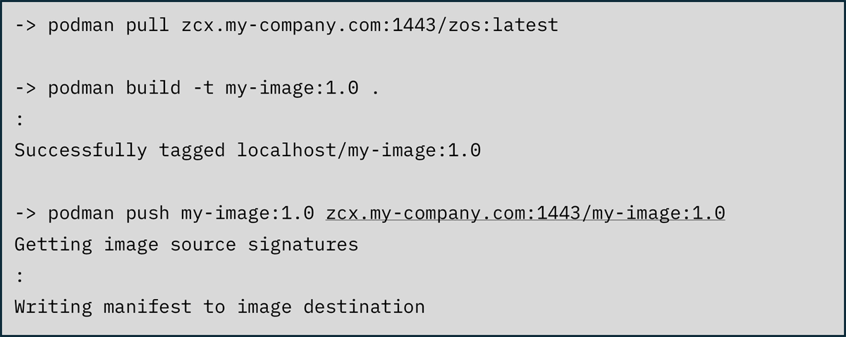 Users are now able to run or pull images from the private container registry using Podman. Any customized container images that are built using Podman can be pushed back to the private registry for others to use. For example, after building a customized container image called my-image from the z/OS base image, it can be pushed directly to the private registry.