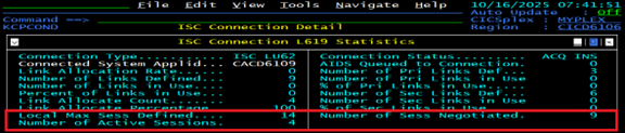 The Enhanced 3270UI now provides detailed session statistics for ISC connections. The ISC Connections Detail workspace provides information about: